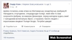 «Щойно почалась нова атака на Житомирську кондитерську фабрику! Нападають спортсмени. Спецпідрозділ поліції, який нібито мав охороняти фабрику за наказом Деканоїдзе, перед нападом кудись зник! У нападників вогнепальна зброя, є поранені, багато людей з переломами кінцівок! Поліція бездіє. Потрібні швидкі!» – написав Кізін.