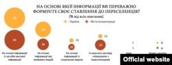 «Як українці ставляться до переселенців» – таке дослідження провело Управління верховного комісара ООН у справах біженців спільно з Київським міжнародним інститутом соціології. Це перше ґрунтовне дослідження в цій галузі. Результати соцопитування в Міністерстві з питань тимчасово окупованих територій і внутрішньо переміщених осіб узяли як основу для розробки програм і стратегій. Збір інформації проводився двома шляхами: дві тисячі респондентів зі всіх регіонів України були опитані особисто і стільки ж респондентів були опитані телефоном.