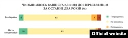 За два роки з початку конфлікту ставлення більшості українців до переселенців залишилося незмінним – такий результат опитування. Загалом 90% опитаних в Україні ставляться до вимушено переміщених осіб позитивно та нейтрально – це число ділиться приблизно порівну. Позитивніше ставлення соціологи відзначають у містах із високою концентрацією переселенців. Більшість опитаних упевнені, що тимчасово переміщені особи стали заручниками обставин, потребують підтримки, не є винними в ситуації, в якій опинилися, і мають такі ж права, як усі інші. Але і такі обов’язки, як військовий, вони повинні нести нарівні з усіма, вважають українці.