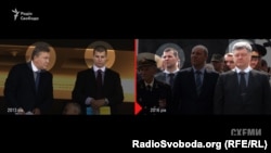 А ще є кадри з відео відомої зустрічі Віктора Януковича і журналістів у Межигір’ї у 2011 році. Вадим Чучковський подає президентським гостям парасольки.