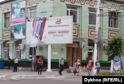Біля входу до мерії стоїть велике червоне серце з написом «Я люблю Приднестровье – 25»: торік святкували ювілей проголошення незалежності «ПМР». Навпроти в фонтані купаються діти. За ними паркан із написом «За власть Советов!».