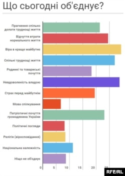 Віра у краще майбутнє та невдоволення владою найбільше об’єднують українців. Ці чинники серед решти запропонованих респондентам набрали майже однакову підтримку – близько 29 відсотків. Замикає трійку варіант «спільні труднощі життя» (майже 27 відсотків).
