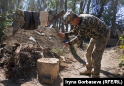 Хрупкое перемирие бойцы ВСУ используют для приведения в порядок своих позиций. Везде – чистота. Аккуратно развешены маскировочные сетки, сложены дрова. Обустроены блиндажи и место для курения. Стиральная машина подключена к генератору. На стене – доска объявлений с последними новостями Генштаба. На кухне – идеальный порядок, даже шкафы для посуды имеются. Их соорудили из ящиков от боеприпасов. На позиции – самодельная подземная баня. Солдаты говорят, что до зимы еще успеют смастерить прачечную. А сейчас полным ходом идет заготовка дров.