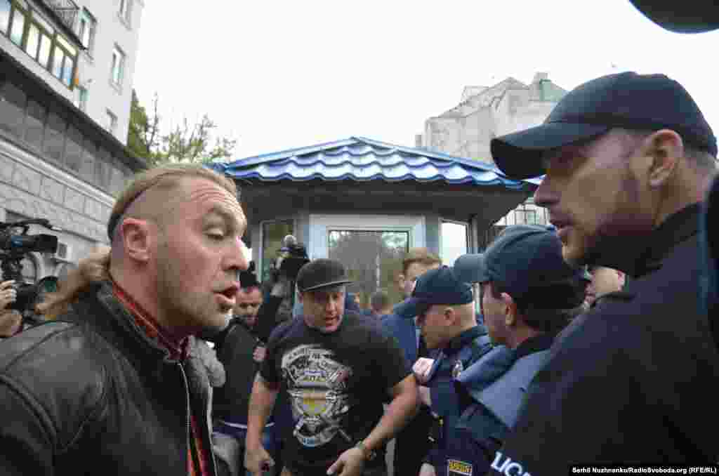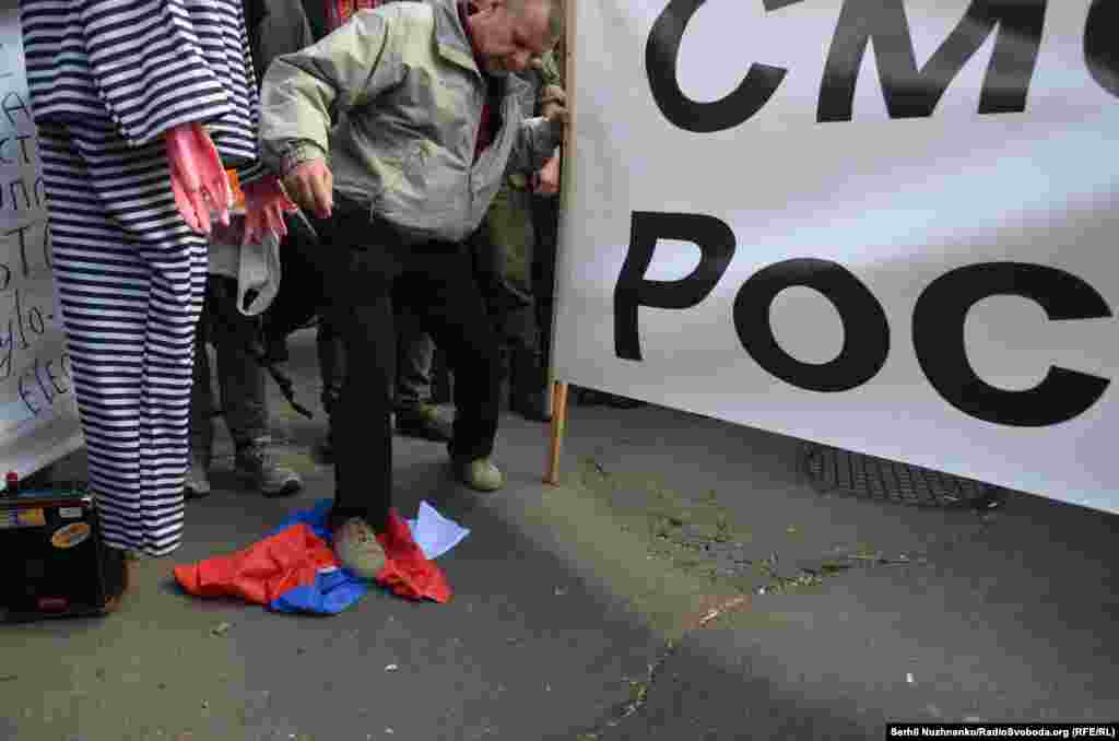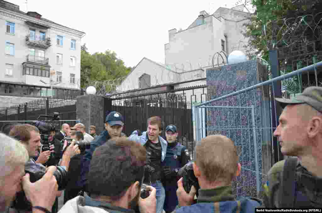 Крім того, як повідомив кореспондент Радіо Свобода, поліція затримала ще одного учасника акції біля російського посольства через інцидент із чоловіком, який, за його словами, хотів проголосувати у будівлі дипломатичного представництва Росії.