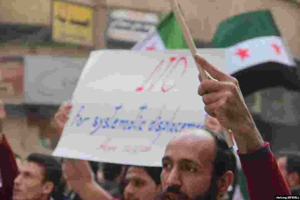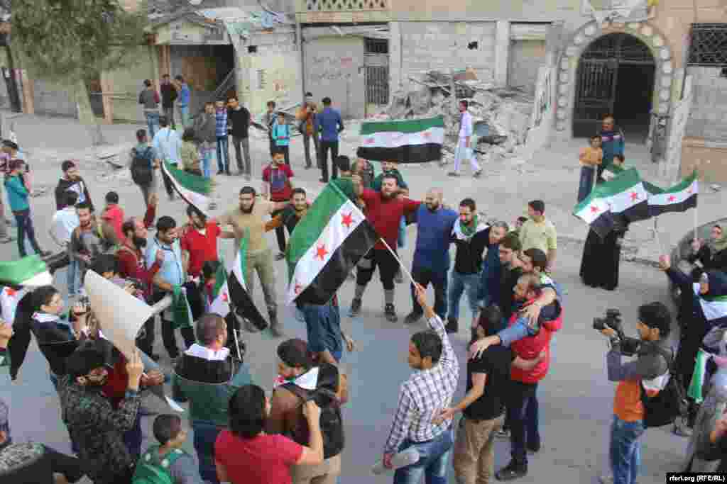 Сирійські активісти у східній частині Алеппо вийшли на знак протесту щодо атак на місто, після запеклих боїв 22 жовтня.