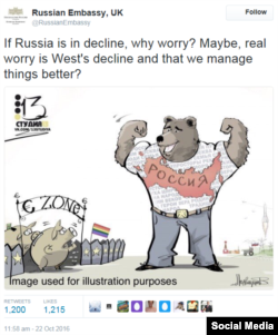 Сторінка посольства Росії у Великобританії в Твіттері має 25 тисяч читачів завдяки своїм часом неоднозначним постам», – йдеться у дайджесті. На зображенні, яке розмістили минулого тижня «виключно в ілюстративних цілях», європейці представлені у вигляді боягузливих свинок, що живуть під прапором, який асоціюється з ЛГБТ-спільнотою. Зображення європейців у вигляді свині-скарбнички може вказувати на орієнтацію на матеріальні цінності. Футболка ж російського ведмедя, навпаки, містить позитив, написи: «сім'я», «віра», «батьківщина», «герої», «традиції», «народ» та інші. На задньому плані: літаки, космічна ракета, Кремль і трактор.