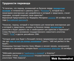 «На рівні самих текстів дослідники також виявили аналогічні політично зручні замовчування, перекручування та зміни», – йдеться у дайджесті. Так, наприклад, стаття Le Figaro, що розповідає про історію кримсько-татарської громади і депортацію кримських татар під час Другої світової війни, згадує, що «незначна меншість представників громади співпрацювали» з німецькими окупаційними силами. У перекладі «ИноСМИ» «незначна меншість» зникає і виходить, що «громада» співпрацювала з ворогами. Є й інші. У перекладах «ИноСМИ» спотворюється оцінка, яку іноземні ЗМІ дають російському керівництву; наприклад, слова про те, що президент Путін «бере участь в операції» «продуманого позування», перетворюються у «продумані дії» і позбавляються іронічних лапок. А «пересування російських збройних сил по Східній Україні» перетворюється в «концентрацію сил уздовж українського кордону», що стає запереченням російської військової присутності на території сусідньої держави. Російський «бліцкриг» перетворюється у «вельми коротку війну», хоча це німецьке слово часто використовується в російській мові.