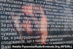 На стендах – фотопортрети з історіями людей, які втекли від війни на Донбасі, прихопивши з собою лише найнеобхідніше.