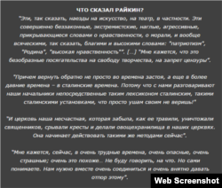 24 жовтня один із найбільш авторитетних і відомих людей Росії виступив на сьомому з’їзді «Спілки театральних діячів Російської Федерації» з промовою проти цензури. Актор і керівник московського театру «Сатирикон», жива легенда, Костянтин Райкін провів паралель між культурним життям сучасної Росії і культурним життям Радянського Союзу часів Сталіна. Райкін рішуче закликав до «цехової солідарності». Він нагадав про свого покійного батька, не менш відомого актора Аркадія Райкіна, одного з небагатьох видатних діячів культури, який пережив сталінський терор. Головна теза виступу Райкіна-молодшого – що цензура сьогодення ніскільки не краща за цензуру часів Сталіна. На його думку, державне фінансування культури не повинно передбачати державний контроль над творчістю. Ці слова були озвучені на тлі нещодавнього примусового закриття експозицій і вистав, а також вказівок від політичного керівництва, як інтерпретувати російську класику.