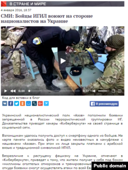 4 cічня 2016 року (майже рік тому) канал Міністерства оборони Росії повідомив, що «український націоналістичний полк «Азов» поповнили бойовики забороненого в Росії терористичного угруповання «Ісламська держава». «Докази наводять хакери «Кіберберкут» на своїй сторінці в соціальній мережі. Хакерам вдалося отримати доступ до смартфону одного з бійців. На карті пам'яті виявилися фото і відео невідомих у камуфляжі з нашивками полку «Азов». При цьому їхні обличчя закриті хустками з арабською в'яззю і традиційною символікою угруповання «Ісламська держава», – розповідає ведучий.