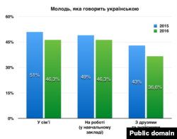 У 2015 та 2016 роках на замовлення Міністерства молоді та спорту України проведено дослідження серед молоді. Результати цих досліджень гнітючі. Лише за рік помітно поменшало молоді, що говорить українською вдома, на роботі та у навчальних закладах, з друзями та знайомими. Впадає в очі, що значна частина молоді, яка говорить українською вдома, переходить на російську в колі друзів. Так чинить майже кожен п’ятий.