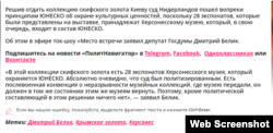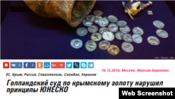 Так, сайт Politnavigator 16 грудня повідомив, що рішення суду Нідерландів повернути скіфське золото Україні нібито суперечить принципам ЮНЕСКО про охорону культурних цінностей.
