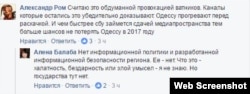 Таких, як Марина Ізосімова, в Одесі чимало. У соціальній мережі «Фейсбук» одесити використовують термін «інформаційна диверсія» і вважають, що треба готувати петиції до Верховної Ради, Національної Ради з питань телебачення і радіомовлення, Українського державного центру радіочастот.