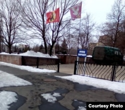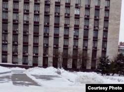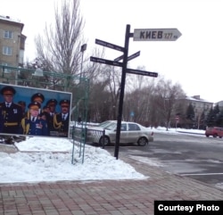 Здание же самой администрации по-прежнему «украшает» надпись «Россия», а рядом находится указатель, к которому, помимо улиц, сепаратисты прикрепили ещё и табличку «Киев 777 км», по аналогии с указателями «Берлин» во Второй мировой.