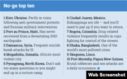 Місто Київ не очолює жоден із цих антирейтингів, та навіть не входить до першої десятки. Про Україну ж згадує сайт escapehere.com, і зазначає, що безпечним для подорожей є Київ та західні області України, тоді як події в анексованому Криму і на Донбасі зробили подорожі на сході України небезпечними.
