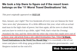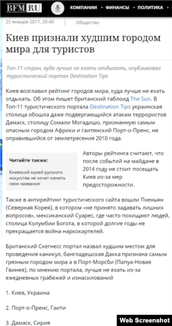 Так, наприклад сайт видання «Вести» із посиланням на видання The Sun, що в свою чергу посилається на сайт Destination Tips, пише: «Київ очолив рейтинг міст світу, куди краще не їхати відпочивати. Автори рейтингу вважають, що після подій на Майдані в 2014 році Київ став настільки небезпечним, що його не варто відвідувати», – йдеться у повідомленні. А далі «Вести» публікують зображення такого антирейтингу.