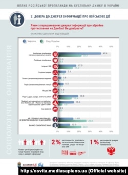 Національне телебачення залишається головним джерелом інформації для українців, але на друге місце вийшли розмови із друзями й родичами. На думку експертів, це робить простішим вкидання російської пропаганди у вигляді чуток. Падає і довіра до українських засобів масової інформації, особливо в південних регіонах країни. Про це свідчать результати опитування, яке провели громадська організація «Детектор медіа» і Київський міжнародний інститут соціології. Експерти розбиралися, наскільки російська пропаганда має вплив на українців.