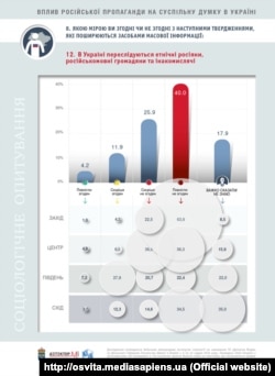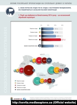 Хоча інформацію про війну на Донбасі і стан справ у Криму з російських ЗМІ отримує лише 2–3% українців, доволі популярними є деякі тези російської пропаганди, що санкції проти Росії будуть незабаром скасовані (понад 38%), що націоналісти в Україні стоять понад законом (близько 27%).