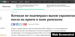 Видання «РБК» повідомило з цього ж приводу, що Ватикан не підтвердив повідомлення про виклик українського посла на прийом до папи Римського.