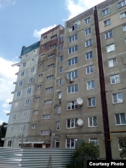 История этого девятиэтажного дома поражала ещё в 2014 году. Он находится у самого выезда из города, и ещё год назад его верхняя часть была полностью снята снарядами – тогда как тут же, этажом ниже, в вечернее время можно было заметить светящиеся окна, в которых люди спокойно ужинали. Сейчас разбитую часть дома удалось отстроить, однако сам дом всё ещё стоит в многочисленных следах от осколков.