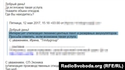 Один з київських підприємців на прохання Радіо Свобода звернувся до цієї фірми з проханням утилізації його відпрацьованих люмінесцентних ламп та акумуляторів, і в листуванні вона підтвердила свою готовність зайнятись ними.