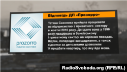 Нерухомість площею 181 квадратний метр обійшлася їй в один мільйон сімсот вісімнадцять тисяч гривень. Квартира в новобудові в центральній частині Києва, на вулиці Січових Стрільців, стала власністю Сазонової всього десять днів тому. Але в будинку ще активно йде ремонт, і мешканців, за словами охорони, тут поки немає. Поговорити із заступником гендиректора Prozorro на роботі теж не вийшло.