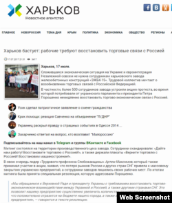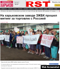 Російська ведуча розповідає: «Жителі Харкова вимагають від влади негайно відновити економічні зв’язки з Росією. Мітинг, на який вийшли 500 осіб, відбувся в понеділок на території місцевого заводу залізобетонних конструкцій. Робочі скандували: «Дайте нам роботу!». Підприємство перебуває на межі розорення. З подібними вимогами до президента Порошенко звернулися вже понад десяток великих виробництв країни».