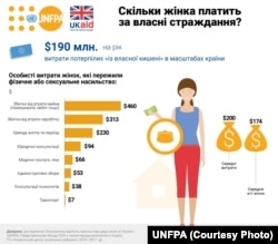 Насильство щодо жінок має економічні наслідки і суму втрат для України у цьому напрямку підрахували у Фонді ООН у галузі народонаселення (UNFPA). За висновками фонду, ці витрати сягають десятків мільйонів доларів, а із врахуванням прихованого характеру проблеми вартість насильства у 20 разів більша за офіційну статистику. Дії щодо попередження насильства щодо жінок в Україні реалізовується переважно за рахунок міжнародних донорів. До того ж депутати Верховної Ради досі не ухвалили закони, спрямовані на запобігання та протидію проблемам у цій сфері.
