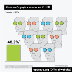 Явка коливалась залежно від дільниці до дільниці. Утім, у громадянській мережі «Опора» ввечері 29 жовтня повідомили, що вона склала 48,2%.