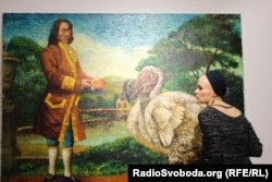 Жінка із баффом на голові привертає до себе увагу. Вона зупиняється біля картини «Паскаль і викопний дронт», уважно вдивляється в кожну деталь. Через трохи часу наближається і нюхає.