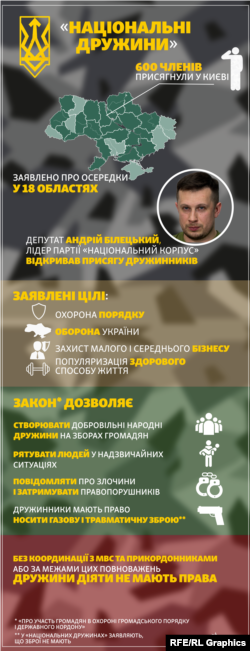 «Національні дружини», які формуються за участі лідерів партії «Національний корпус», мають намір наводити лад на вулицях, зокрема і зі застосуванням сили, допомагати поліції та займатися вихованням молоді, стверджують представники дружин. Між тим, низка українських експертів говорить про фактичне створення парамілітарних структур в інтересах окремих політиків, серед яких називають і нинішнього очільника МВС Арсена Авакова. Частина фахівців вбачають у цьому ризик дестабілізації та підігрування російській пропаганді.