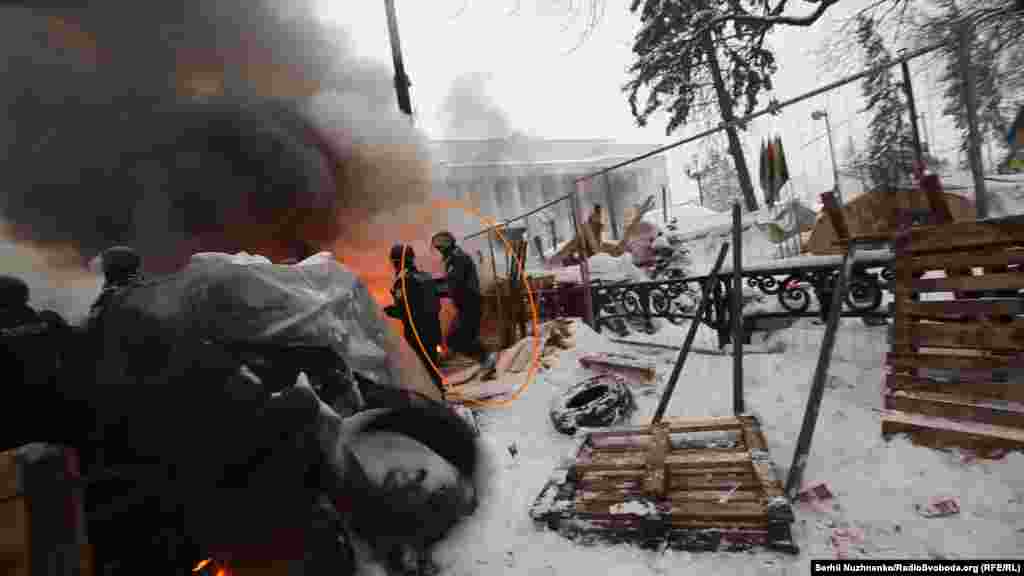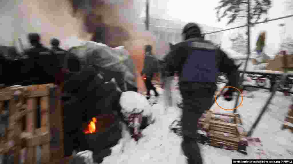 На фото поліцейський із балончиком в руках, який вибігаї із-за спини кореспондента Радіо Свобода Сергія Нужненка