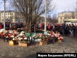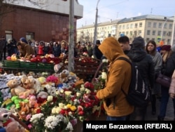 До ТЦ, де сталася пожежа, люди несуть квіти та іграшки, запалюють свічки.