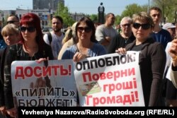 Поруч з ними мітингують еко-активісти з вимогою до мерії виконати зобов’язання щодо фінансування закупівлі пересувної еко-лабораторії для міста. Питання, що підіймають ці дві групи протестувальників, винесені на порядок денний сесії міськради.