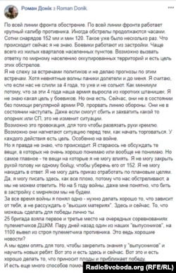 За словами волонтера Романа Доніка, військове загострення наразі відбувається по всій лінії фронту, де по українських позиціях працює великокаліберна техніка підтримуваних Росією бойовиків, а самі обстріли «продовжуються годинами».