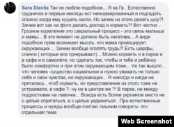 «Мені от не подобається, коли у жінок сідниці з-під шортів вивалюються, або целюліт розміром із Марс, але тут скажуть: «Так це що, через твої смаки людині ціле літо в штанах паритися?» Так що, через ваші смаки дитина має заходитися від голодного плачу?» – пояснює жінка.