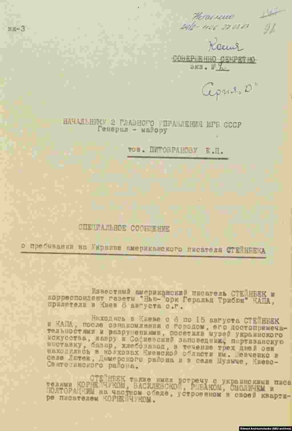 «Спеціальне повідомлення про перебування в Україні американського письменника Стейнбека» МДБ УРСР