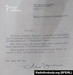 Продовжуючи роботу з архівними документами, що стосуються справи Володимира Медведчука, Радіо Свобода вже після публікації цього матеріалу натрапило на заяву, яка свідчить про те, що його син Віктор таки звертався за довідкою про реабілітацію батька.
