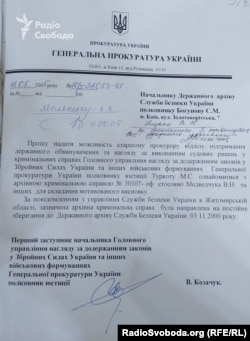 Поміж 825 сторінок трьох томів архівно-слідчої справи, в якій фігурує Володимир Медведчук, особливу увагу привертають два документи. Перший – датований 2005 роком. Це – звернення Генеральної прокуратури України до Галузевого державного архіву СБУ. У ньому полковник Козачук просить архівістів надати можливість представнику ГПУ ознайомитись з цими матеріалами «для складання мотивованого висновку».