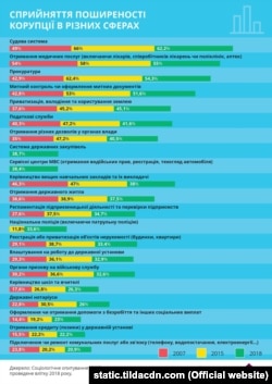 Так, українські суди вважають найбільш корумпованими, і частка людей, які називають їх такими, росте. Сферу медичних послуг та прокуратуру, які теж серед лідерів «антирейтингу», вважають корумпованими приблизно 55% респондентів, і цей показник в різні роки є відносно стабільним.