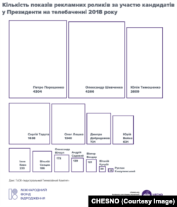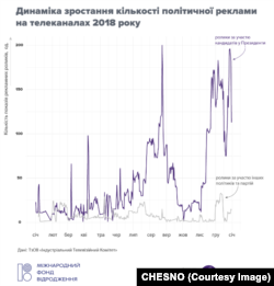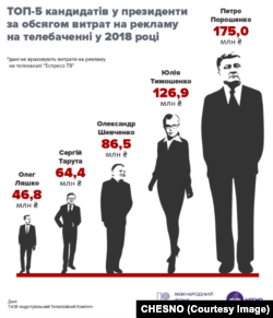 Політики та партії витратили на телерекламу більш ніж 647 мільйонів гривень у 2018 році. Близько 568 мільйонів з них мала б коштувати політична реклама кандидатів у президенти. Більшість цих видатків не потрапила до офіційної звітності політичних партій, а отже, залишається невідомим походження коштів, якими оплачувалася реклама. Рух «Чесно» проаналізував обсяги та вартість політичної реклами і те, які кандидати, як часто, на яких телеканалах з’являлись у рекламних блоках на ТБ та скільки це коштувало.