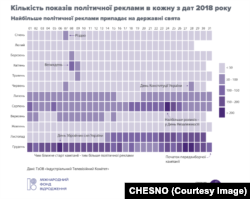 Графік-календар демонструє, скільки політичної реклами транслювали на ТБ у кожну з дат 2018 року. Найбільше політичної реклами було у серпні та вересні, а також у грудні. Найвища ймовірність натрапити на ролик з кимось із кандидатів спостерігається на державні свята, такі, як Великдень, Новий Рік та Різдво, коли політики традиційно вітають громадян.