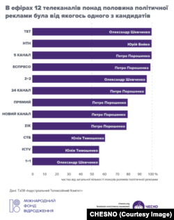 Цікаво також, що реклама чинного президента виходила на найбільшій кількості телеканалів – 12. Для порівняння: рекламу Олександра Шевченка, Юрія Бойка, Олега Ляшка транслювали по 7 телеканалів, Тимошенко – 5.