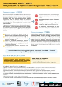 Виконавчий директор Української Гельсінської спілки з прав людини Олександр Павліченко розповів Радіо Свобода про особливості підготовки до розгляду Верховною Радою низки відповідних законопроектів. Так, до порядку денного включені, серед інших, розгляд змін Закону України «Про боротьбу з тероризмом (щодо основ соціального захисту заручників)» та проект закону «Про правовий статус і соціальні гарантії осіб, які незаконно позбавлені волі, заручників, або засуджених на тимчасово окупованих територіях України та за її межами». Цей законопроект, зареєстрований під номером 8205, правозахисники вважають за доцільне ухвалити якнайшвидше, зазначив Павліченко.