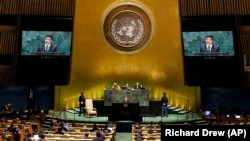 Президент України Володимир Зеленський тримає кулю під час виступу на сесії Генеральної асамблеї ООН. Нью-Йорк, 25 вересня 2019 року