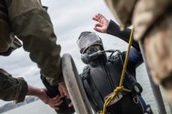 Водолаз отправляется на тренировку по подводным монтажным работам