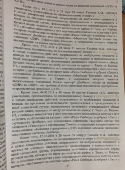 – Мене не катували, тому що я реально писав про Україну статті. Мене є за що переслідувати. Я робив фото. А фото вважається у них «шпигунством». Хоча, от я робив фото на власний фотоапарат – але не було доказів того, що я робив ці фото. Однак є самі знімки. І факт цих «злочинів» фіксується, що я «вступив у злочинну змову» незрозуміло з ким, з редактором, у конкретну годину – це просто час розміщення цієї публікації на Радіо Свобода. І подібна фраза повторюється 60 разів.