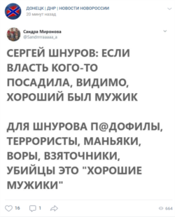 Но есть ресурсы, которые избрали антимосковскую риторику. В их числе – популярные среди сторонников российской агрессии на Донбассе «Новороссия-инфо» и «Русская весна». Они цитируют боевика Гиркина, а он, как известно, критикует недостаточно жесткую, по его мнению, политику Путина на Донбассе.