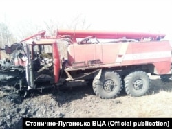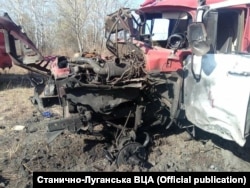 Але поряд із перемогою рятувальників над великим вогнем уже запалали нові ділянки. У четвер в області сталось 44 займання, чотири з яких переросли в пожежі. І в одній із таких у п'ятницю вранці сталась трагедія. Пожежний автомобіль ДСНС наїхав на міну. Рятувальник і двоє лісників зазнали важких поранення. На фото видно, що вщент розбита вибухом саме кабіна.