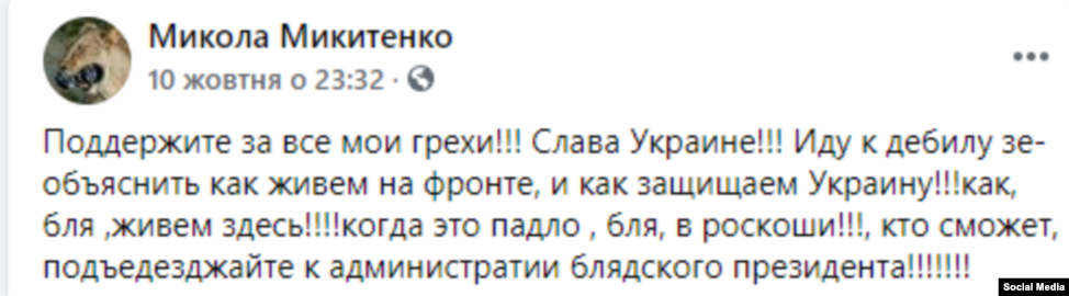 Дещо раніше Микола Микитенко писав, що піде пояснювати, як він висловився, «зе», як живеться на фронті і закликав приєднуватися до нього біля адміністрації президента.